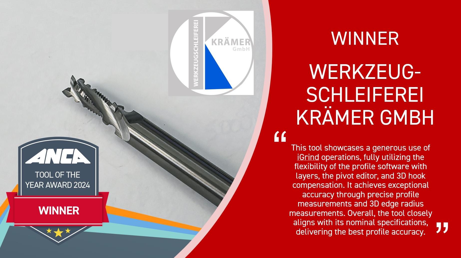 Die Werkzeugschleiferei Krämer wurde 2024 mit dem renommierten „Tool of the Year“-Award ausgezeichnet. Dieser Preis würdigt herausragende Qualität, Innovation und Präzision in der Werkzeugfertigung. Mit modernster Technologie und handwerklichem Know-how konnten wir die Jury überzeugen. Die Auszeichnung ist ein Beleg für unsere hohen Standards und unser Engagement für exzellente Ergebnisse. Wir danken unseren Kunden und Partnern für ihr Vertrauen, das diesen Erfolg möglich gemacht hat.